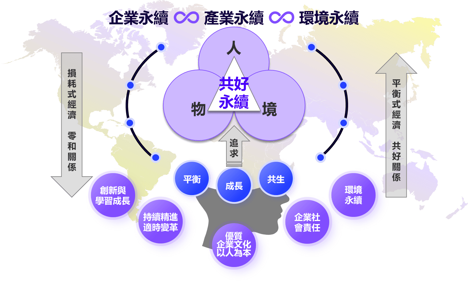 期透過政府資源,厚植我國企業技術水準、創新研發能力,強化企業經營體質,以更前瞻、國際化與多元化的服務,為企業創造附加價值,密接國家重要產業政策與企業發展,強化競爭優勢,整體產業發展,奠定厚實的競爭基礎,邁向永續經營。配合整體永續發展策略,同時於CPC WAY增列「我們承諾為朝永續發展(ESG)目標戮力不懈」之精神。