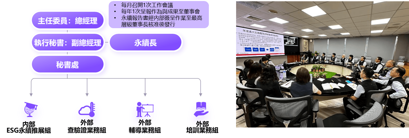 自2022年4月13日於第28屆第5次董監事會,提報通過「CPC ESG新事業發展委員會」之成立,委員會積極「對內」規劃ESG相關作為,以重視利害關係人期望,落實內部永續管理機制;亦「對外」推展ESG服務能量,係依循行政院國發會2022年3月30日發布之「臺灣 2050 淨零排放政策路徑藍圖」,由總經理帶領,下設4個工作小組,並由協理、主任等層級主管擔任組長,共同盤點出政策或承諾/管理行動及短中長期目標,及執行過程監督與成果評估。